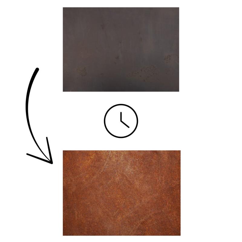 COR-TEN® je speciální legovaná ocel navržená pro dlouhodobé venkovní použití. Na povrchu vytváří přirozenou ochrannou patinu - tenkou vrstvu rzi, která zabraňuje další korozi. Tento proces je poháněn střídáním vlhkosti a sucha, a po stabilizaci vzniká pevný a odolný povrch, který nevyžaduje žádnou další údržbu nebo nátěry.