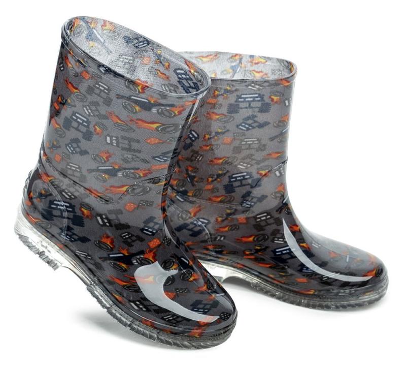 Obuv je vyrobená z priehľadného gumového materiálu. Vnútorná časť obuvi je vybavená textilnou podšívkou, ktorá tvorí farbu a motív čižmy.