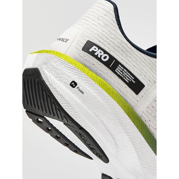Craft PRO Endur Distance nedisponuje karbónovou platňou. Vďaka tomu síce nemá tuhosť potrebnú pre dosiahnutie najvyššej možnej rýchlosti, ale o to všestrannejšia táto topánka je. Agresívna geometria vyzývajúca k dopadu na stred chodidla v kombinácii s energetickou penou PX foam zabezpečí príjemne svižný odraz aj pri intervaloch, tempovom tréningu, alebo dlhšom závode. Vyššia mäkkosť je dostatočne šetrná k vašim chodidlám a achilovkám, takže sa PRO Endur Distance skvele hodí pre každodenné nabiehanie kilometrov.