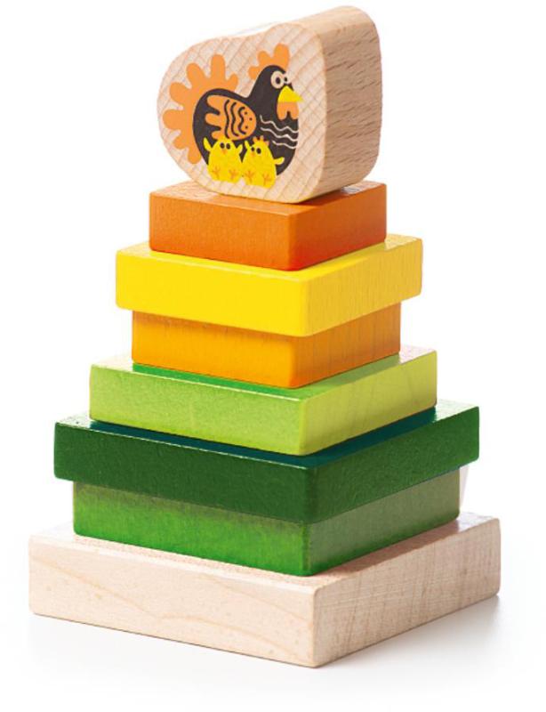 Barevná pyramida se slepičkou je dřevěná skládačka s 8 díly, které by na sebe měly být poskládány tak, aby bylo možné zachovat při stavbě správný tvar starodávné egyptské pyramidy a zároveň zachovat