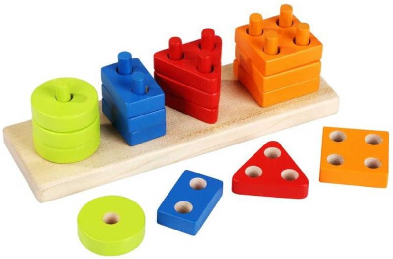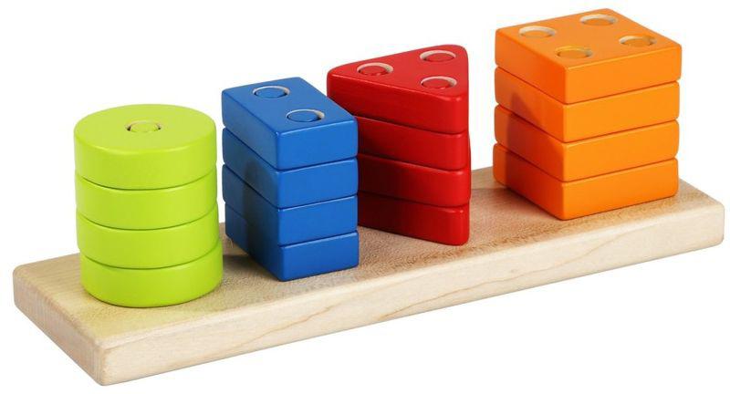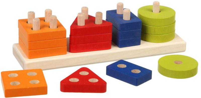 Třídíme tvary V je dřevěná skládačka s 16 barevnými perforovanými geometrickými tvary, které se umísťují na čtvercovou základnu. Jednotlivé tvary mají i své opakující se barvy, které se děti touto hrou