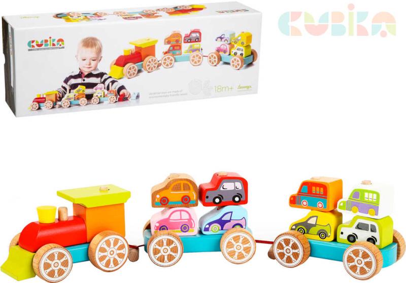 Cubika DŘEVO Baby Vláček s auty navlékací stavebnice set 14 dílků