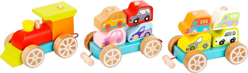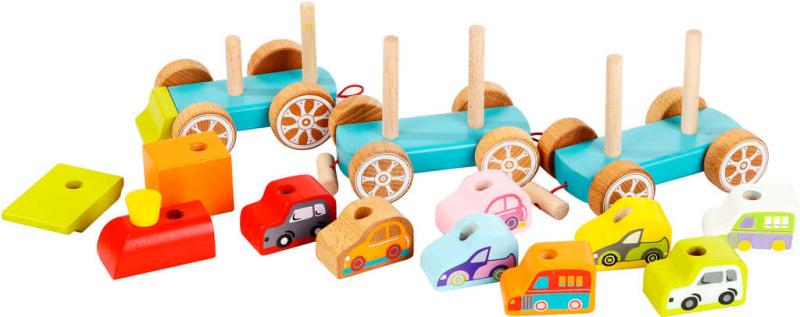Vláček se dvěma vagony a auty je dřevěná skládačka se 14 barevnými díly, které je třeba poskládat tak, aby nákladní vlak mohl převážet hromadně všech 8 autíček.