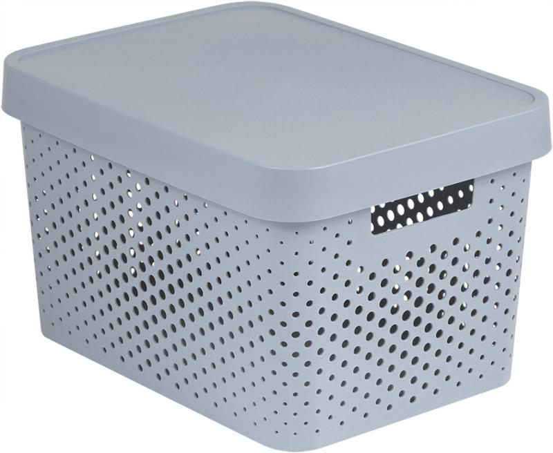 Světle šedá barva a propracovaný design s dírkami ve stěnách definují praktický box o objemu 17 litrů. Včetně víka a děr pro přenášení. Vyrobené ze 100% recyklovaného plastu. Hmotnost 600 gramů.Světle šedý box Infinity Dots značky Curver je vyrobený ze 100% recyklovaného plastu. Přepravka o objemu 17 litrů má praktické víko, takže udrží vše perfektně uvnitř. Navíc je díky tomu můžete stohovat na sebe.