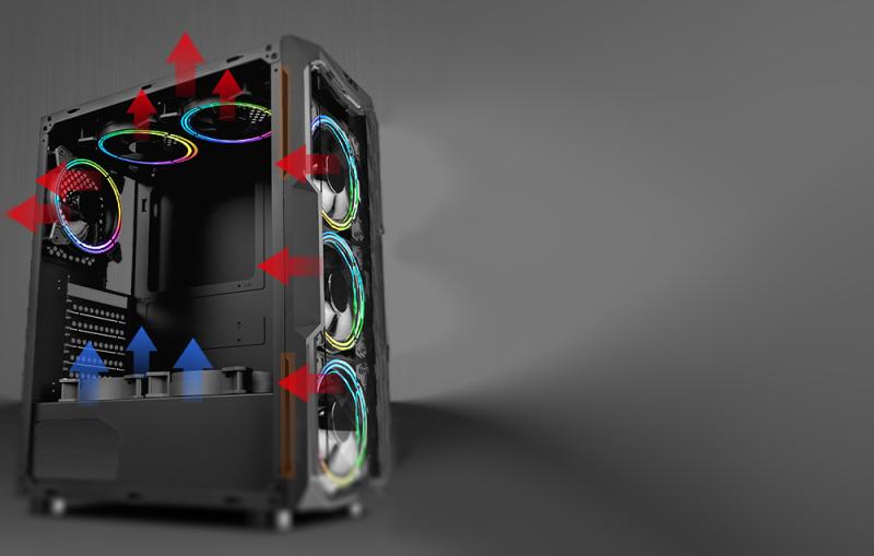 Přední: 120mm ventilátor x3; Zadní: 120mm ventilátor x1; Horní: 120mm ventilátor x2; Spodní část: 120 mm ventilátor: 120mm ventilátor x2; (ventilátory nejsou součástí dodávky) |
