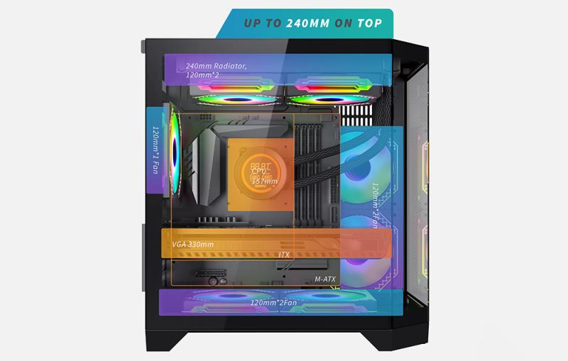 FT350 umožňuje vytvořit rozsáhlý systém odvodu tepla - pojme až 7 ventilátorů. Můžete do ní také nainstalovat 240mm vodní chlazení. To vše vám umožní svobodně hrát dynamické hry nebo vytvářet složité grafické projekty - bez obav, že se počítač přehřeje! Navíc v balení najdete pět výkonných ventilátorů ARGB, které se vyznačují nejen vysokou účinností, ale také moderním stylovým designem.