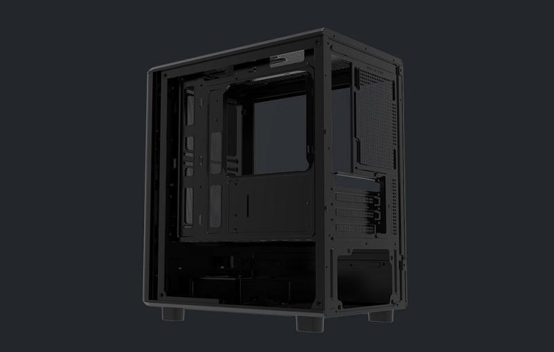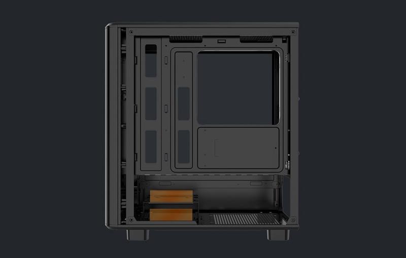 Levý panel je vyroben z tvrzeného skla, které odhaluje vnitřek počítače a komponenty s podsvícením RGB. Panel lze snadno vyjmout bez použití nářadí.