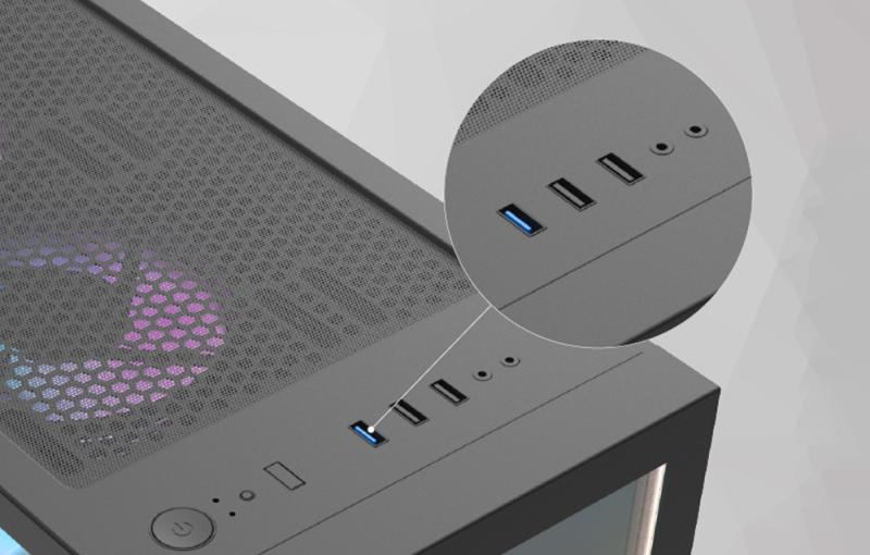 Na horní straně najdete vypínač, porty USB 3.0, USB 2.0 a HD audio. Snadno tak získáte přístup k obsahu jakéhokoli přenosného paměťového zařízení a připojíte herní sluchátka, ať už s rozhraním USB nebo minijack. Díky tlačítku LED můžete také ovládat barvu a typ podsvícení RGB uvnitř skříně.