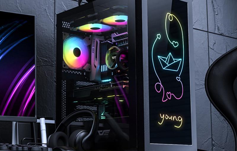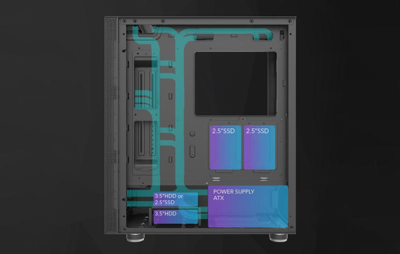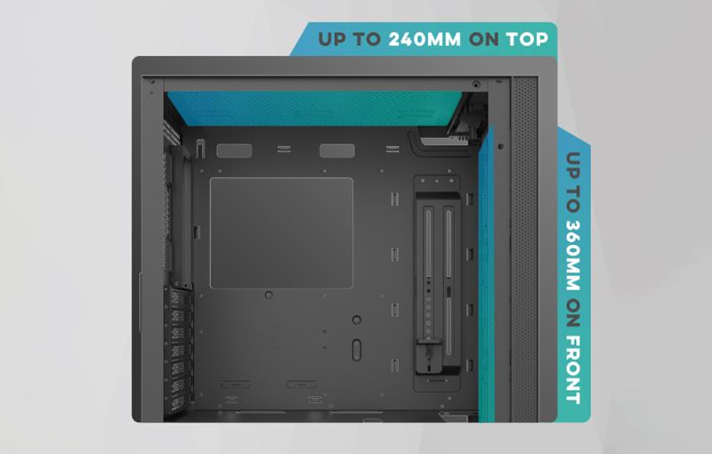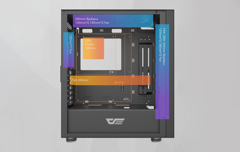 Dodejte své počítačové skříni vlastní charakter! Díky jedinečnému přednímu panelu můžete skříň ozdobit vlastní kresbou nebo nápisem, který nejenže odpovídá vašemu stylu, ale také mění barvu díky kompatibilitě s podsvícením ARGB. Skříň DK210 lze vybavit přídavným chlazením. Na přední stranu můžete umístit 360mm chlazení, na horní 240mm a na zadní 120mm. Tímto způsobem nejen zdůrazníte herní vzhled skříně, ale také zajistíte optimální chlazení vašich komponent. Rozhraní USB 3.0, USB 2.0 a HD audio naleznete na horním panelu pro snadný přístup.