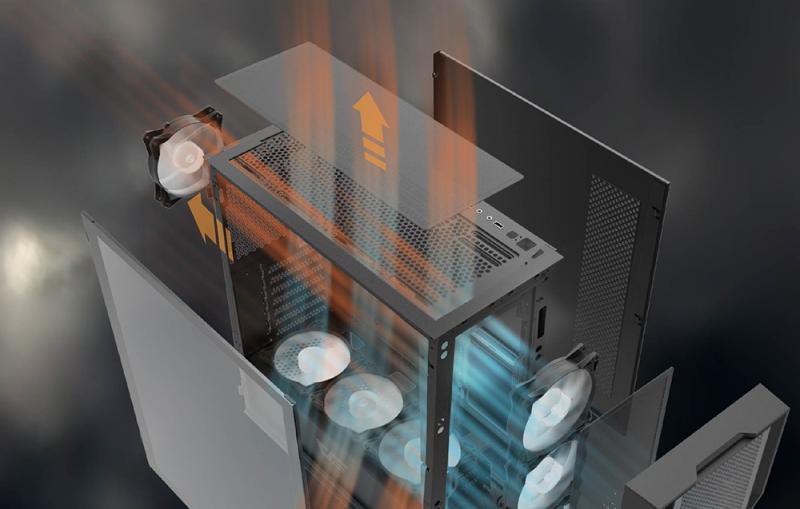 Hrajte dynamické hry a mějte jistotu, že se váš počítač nepřehřeje. Skříň DK431 umožňuje montáž až 12 120mm nebo 8 140mm ventilátorů. Je také vybavena větracími otvory na bočním panelu pro ještě lepší odvod tepla. Navíc můžete do horní nebo přední části skříně nainstalovat 360mm vodní chlazení. Poznámka: není možné současně instalovat ventilátory na pravou stranu a vodní chlazení na přední stranu skříně.