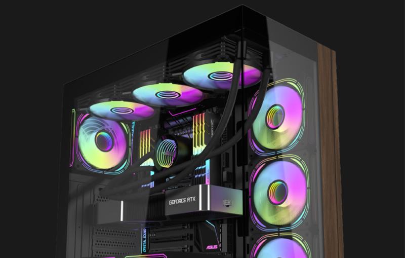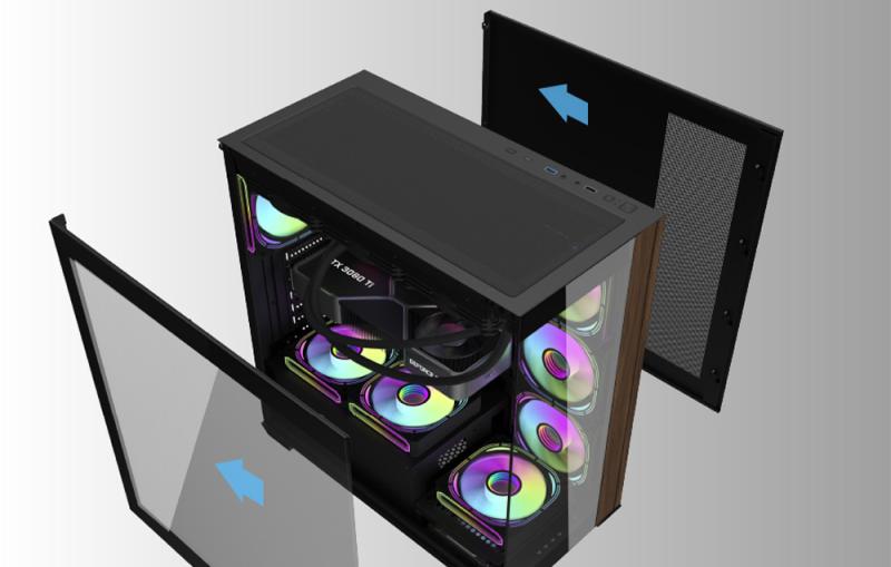 Počítač Darkflash DS900W je určen pro ty, kteří hledají elegantní, futuristický design v kombinaci s funkčností. Přední strana s dřevěným akcentem a konstrukce z oboustranně tvrzeného skla dodávají skříni jedinečný styl a poskytují 270° panoramatický výhled na komponenty bez rušivého A-sloupku, díky čemuž je celá vnitřní kompozice estetická a přehledná. Se skříní Darkflash si vybudujete stylový herní prostor a zároveň poskytnete svým počítačovým komponentám maximální ochranu.