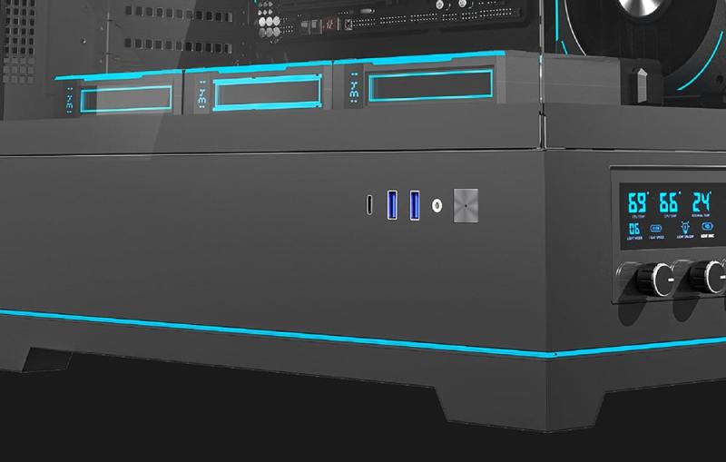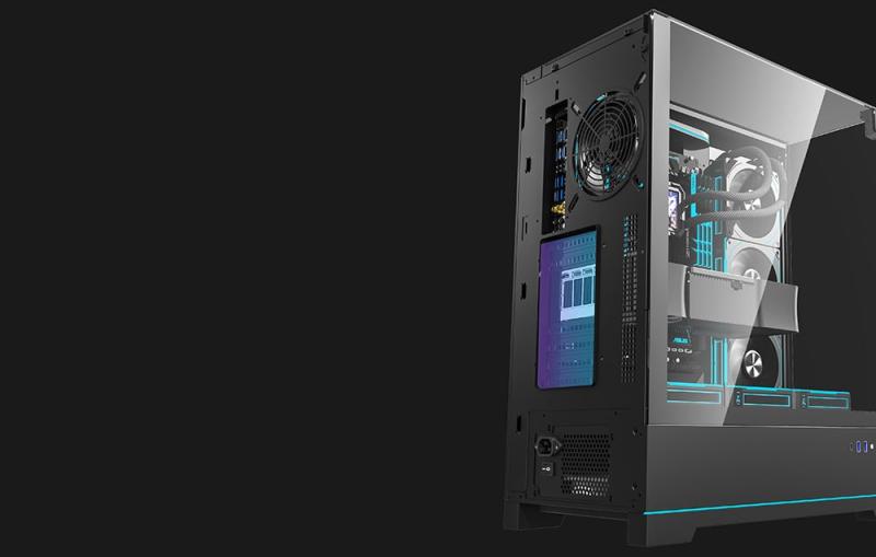 Darkflash DY450L PRO je vybavena digitálním systémem řízení teploty, který zajišťuje monitorování teplot GPU, CPU a vnitřní teploty skříně v reálném čase. Panel s knoflíky na přední straně umožňuje přesné ovládání rychlosti ventilátorů, což umožňuje optimalizovat chlazení podle zatížení systému.