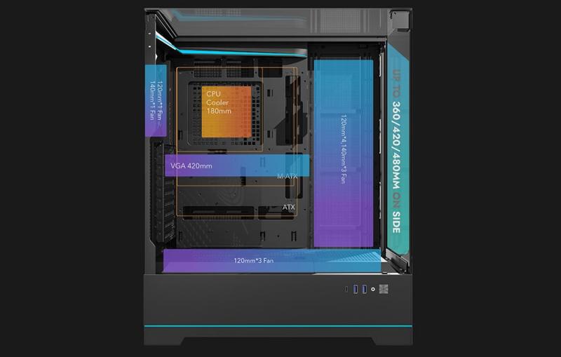 DY450L PRO podporuje instalaci až 8 ventilátorů a vodních chladičů o délce až 480 mm, což zajišťuje výjimečný výkon i při náročném používání. Skříň pojme také grafické karty o délce až 420 mm a chlazení procesoru o výšce až 180 mm, takže je vhodná pro rozsáhlé herní konfigurace.