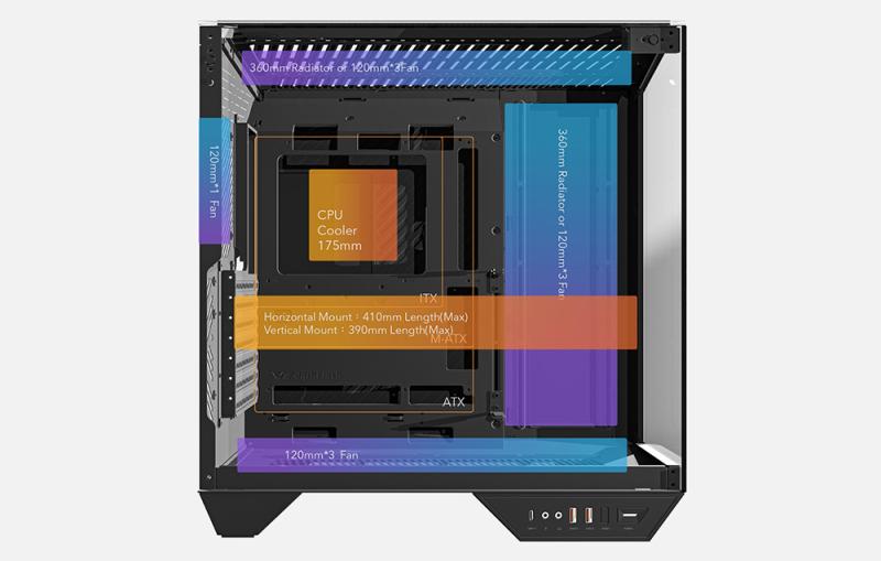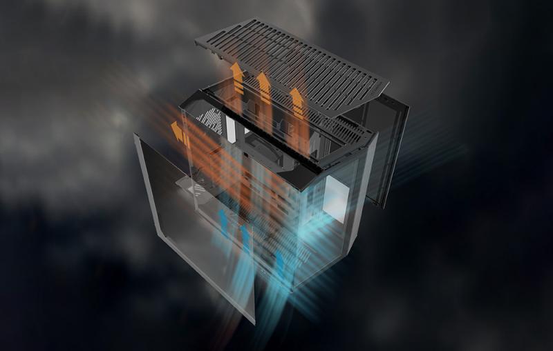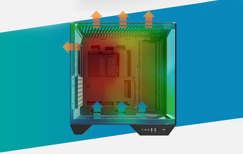 Skříň poskytuje rozsáhlé možnosti chlazení, takže je ideální i pro ty nejnáročnější konfigurace. Umožňuje instalaci až 10 120mm ventilátorů, takže snadno zajistíte účinnou cirkulaci vzduchu a dostatečnou teplotu uvnitř. To však není vše. DY470 umožňuje instalaci dvou 360mm vodních chladičů, které zaručují efektivní a stabilní provoz počítače i při velkém zatížení.