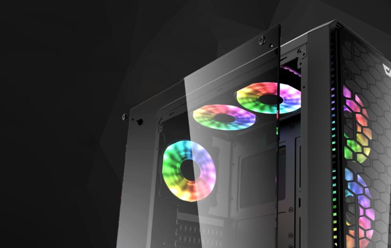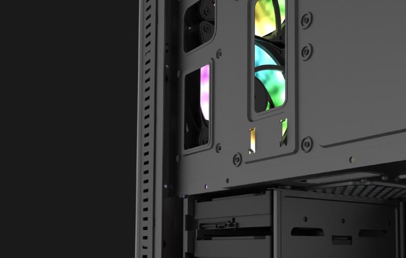 Nebojte se, že se váš počítač přehřeje. Výrobek pojme až 8 ventilátorů (k dispozici samostatně) a je vybaven vnitřním chladicím kanálem. Máte možnost instalovat 240mm systém vodního chlazení nebo 2 120mm ventilátory do horní části skříně. V přední části můžete umístit 360mm podložku vodního chlazení nebo 3 x 120mm ventilátory. V zadní části skříně poskytuje skříň prostor pro jeden 120mm ventilátor. Nad napájecím zdrojem skříň poskytuje prostor pro 2 ventilátory pro účinnější chlazení a zajímavý RGB efekt.