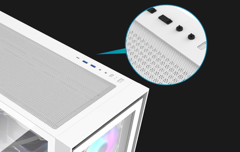 Skříň je vybavena širokou nabídkou portů, včetně USB-C, USB 3.0, USB 2.0, vstupu pro mikrofon a výstupu pro sluchátka. Můžete tak pohodlně připojovat periferní zařízení a přenášet soubory! Součástí balení jsou také speciální protiprachové kryty, které chrání konektory před nečistotami a zajišťují jejich dlouhou životnost.