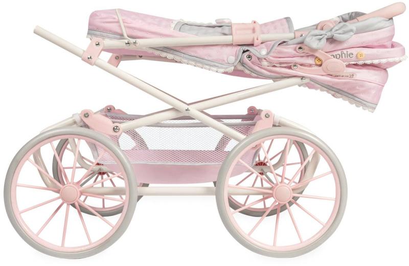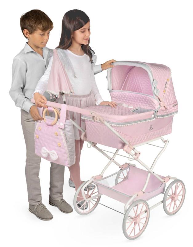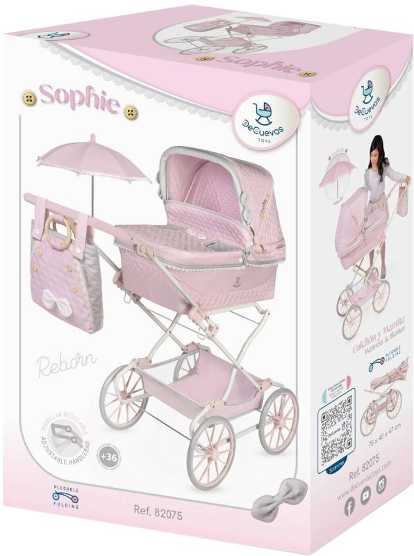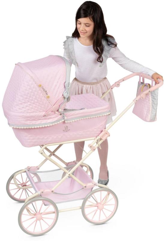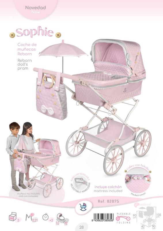 DeCuevas 82075 Skládací kočárek pro panenky REBORN se slunečníkem a doplňky Sophie 2025 - 90 cm ze stejnojmenné kolekce, která je novinkou roku 2025, je díky vyšší polohovací rukojeti a celkové konstrukci spíš vhodný pro větší slečny. Něžná dívčí kolekce Sophie je nepřehlédnutelná pro každé děvčátko. Světle růžová barva dominuje celé kolekci. Doplněná je o světle šedivé a bílé kraječky a mašličky, které zdobí všechny výrobky této rozmanité kolekce a ještě více podtrhují nádech romantiky. Kolekce nabízí nejen zmíněné kočárky, ale i jiné doplňky pro malé slečny a jejich panenky. Nádherný španělský design, precizní zpracování. Skládací model, velmi snadná manipulace během samotné hry. Materiál: kov, plast, textil. Baleno v krabici v barvách kolekce.