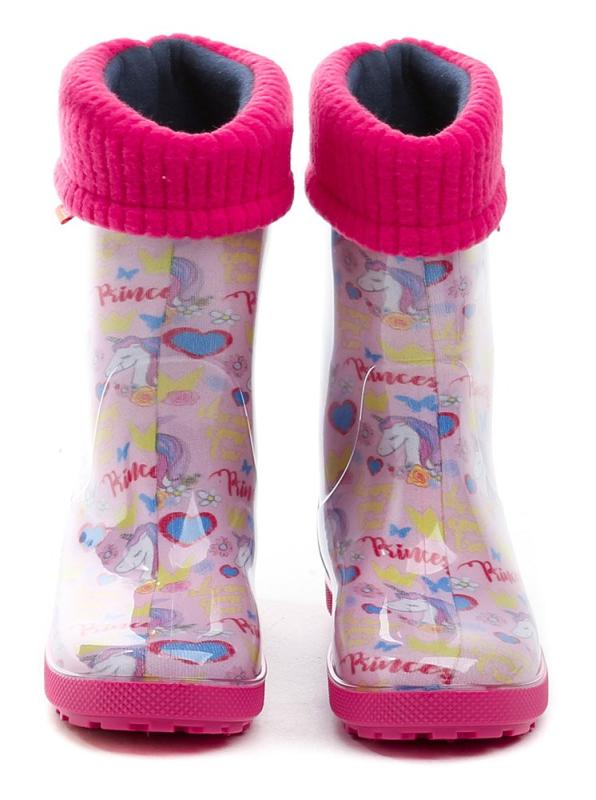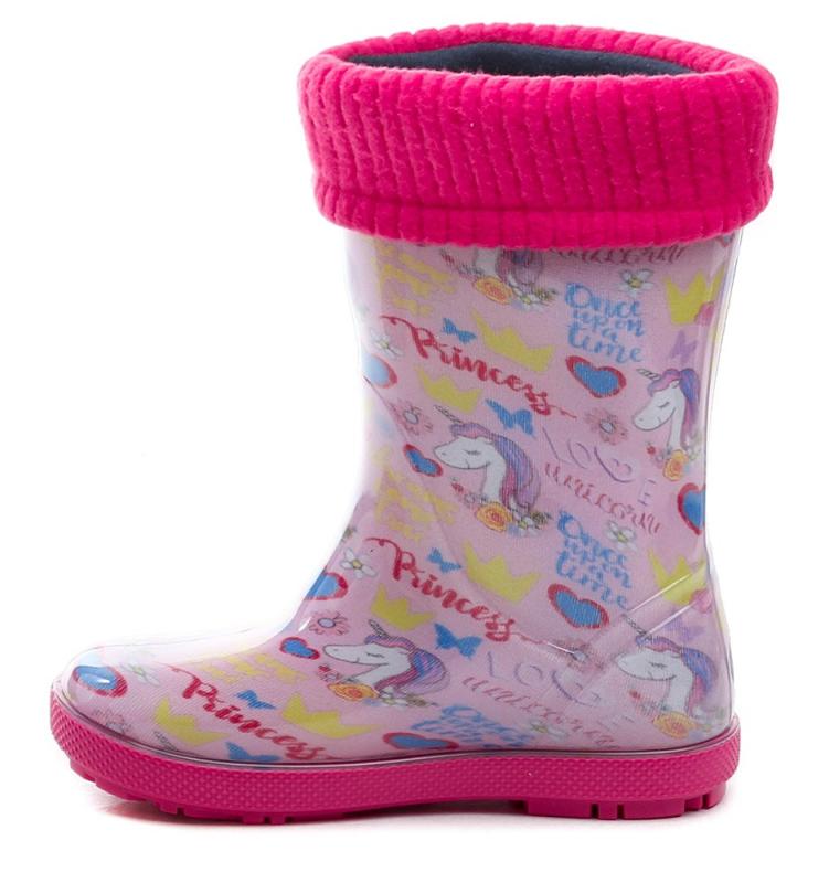 Tyto dětské gumáky jsou navrženy pro celoroční použití a nabízejí spolehlivou ochranu před vlhkostí díky syntetickému nepromokavému materiálu. Uvnitř je vsunutá vyjímatelná pěnová textilní vložka, která zajišťuje příjemné zateplení a pohodlí i během chladnějších dnů. Límec je ozdobně zahnutý přes okraj, což přidává na atraktivitě a zároveň usnadňuje obouvání.