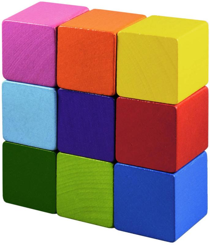 Velké dřevěné barevné kostky o velikosti 35mm. Balení obsahuje 9 různě barevných kostiček.Při stavění kostek si dítě procvičí motoriku, logiku a zjistí, jak funguje rovnováha. Výrobek splňuje požadavky EU na bezpečnost hraček a je vhodný pro děti od 1 roku.