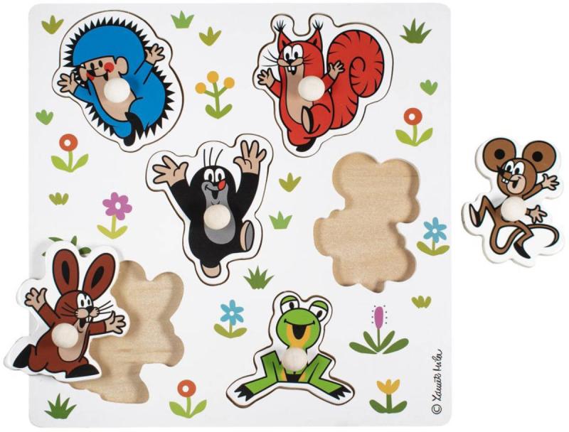Didaktické vkládací puzzle Krtečka a jeho přátel. Hra učí děti poznávat tvary a pomáhá rozvíjet motoriku rukou. Výrobek splňuje požadavky EU na bezpečnost hraček a je vhodný pro děti od 18 měsíců. Dřevěná vkládačka pro malé děti s úchytkami. Dítě se podle obrysů a tvarů snaží najít správný obrázek (rozvoj představivosti a logického myšlení), a umístit jej do správného otvoru (rozvoj jemné motoriky).