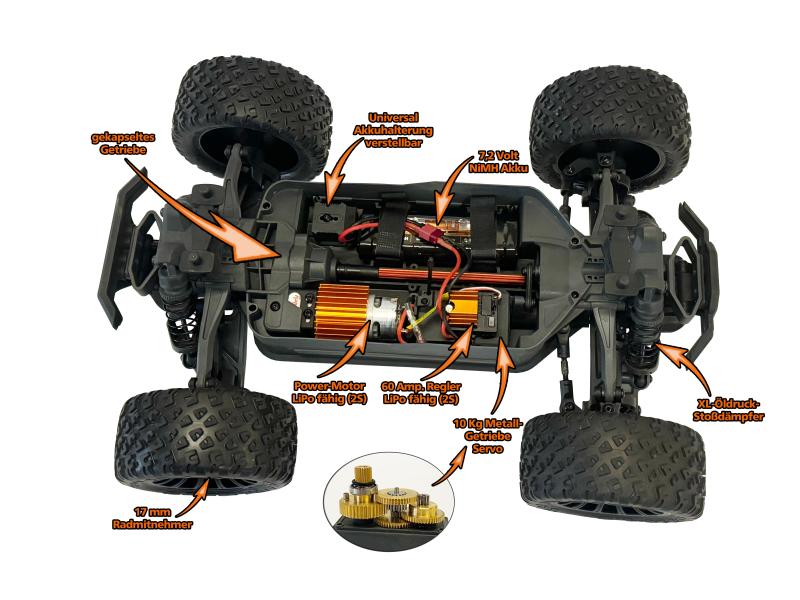 Modely jsou poháněny výkonným stejnosměrným motorem, zcela novým, kvalitním regulátorem otáček DF Models DF-1060 s výkonem 60 A a 7,2 V NiMH akumulátorem, takže model zrychluje až na cca 40 km/h. Servo řízení DF-1000D o hmotnosti 10 kg s kovovou převodovkou XXL poskytuje dostatečný výkon v každé situaci. Maximální rychlost lze snížit dálkovým ovládáním pomocí přepínací funkce na dálkovém ovladači (maximální rychlost 100 - 75 - 50 % nastavitelná!). Díky tomu je model ideální pro začátečníky, kteří se chtějí pustit do RC sportu!