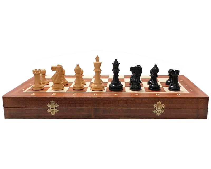Součástí dodávky je skládací intarzovaná dřevěná šachovnice s popisem o rozměru 51x51. Lze ji složit na rozměr 53x26,5 a dovnitř lze uložit všechny figurky, kromě obou dam navíc (ty jsou přibaleny zvlášť).