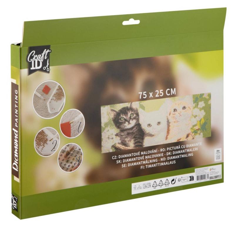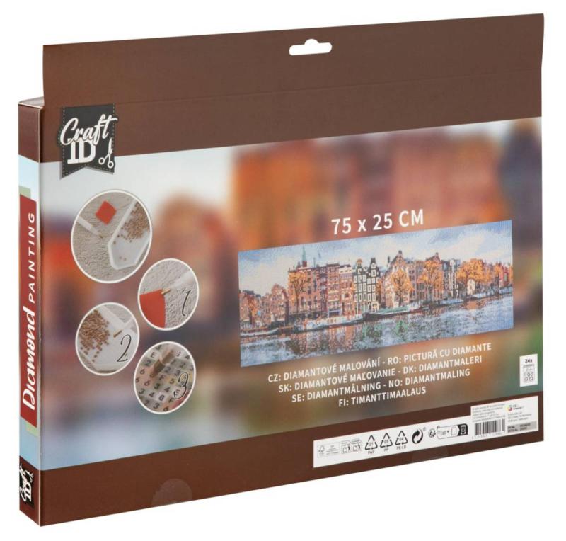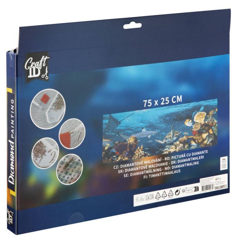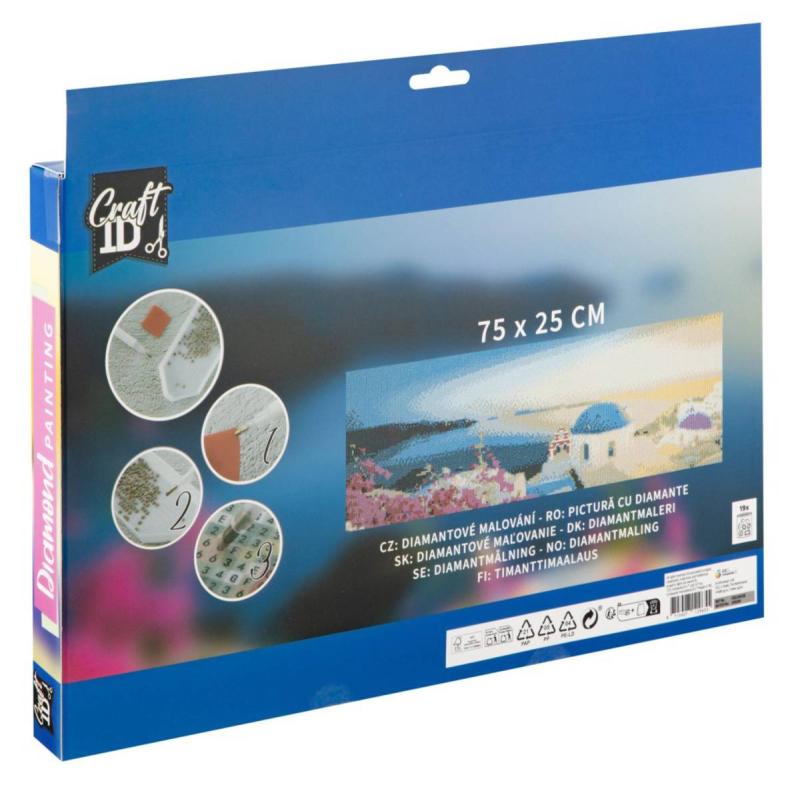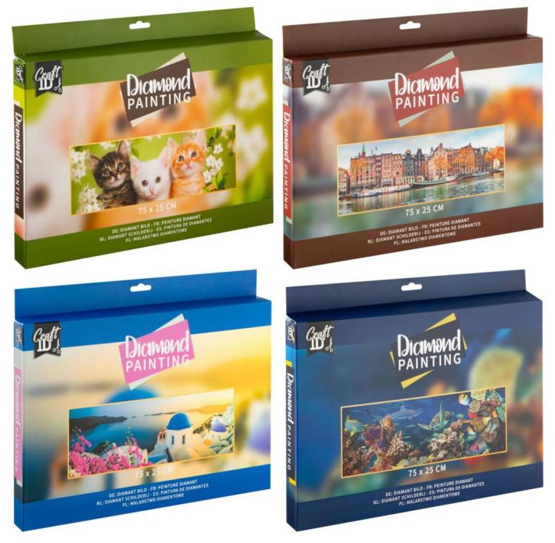 Pusťte se do tvorby detailního mozaikového obrazu pomocí techniky Diamond malování. Výsledná obrázek má velikost 75×25 cm. Sada obsahuje plátnos předtištěným vzorem a speciální lepící vrstvou, sadu barevných kamínků, aplikační pero, vosk a misku na kamínky. Ve čtyřech vzorech - koťátka, holandské město, podmořský svět a řecké moře.
