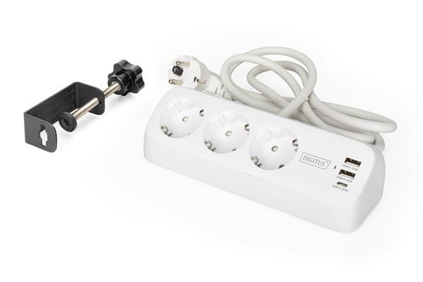 DIGITUS 3cestný kancelářský prodlužovací kabel s 2x USB-A a 1x USB-C porty, bílý