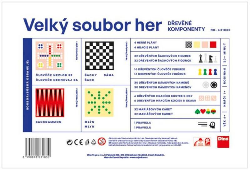Velký soubor her s dřevěnými komponenty je kolekce 150 klasických společenských her, které zahrnují jak známé, tak i netradiční varianty. Tento rozsáhlý soubor klasických her by neměl chybět v žádné rodině!Mezi obsaženými hrami v tomto souboru 150 herních variant patří šachy, dáma, mlýn, halma, samotář, Člověče, nezlob se!, backgammon (vrchcáby), hry s kostkami, mariášové karty a kvarteto. Herní desky jsou vyrobeny z pevného kartonu, zatímco figurky a hrací kameny jsou dřevěné. Pokud se rozhodnete zahrát si každou hru jen jednou, máte před sebou více než 100 hodin skvělé zábavy. Hry trénují logické a strategické myšlení a se souborem si dobře vyhrají děti již od 6 let.