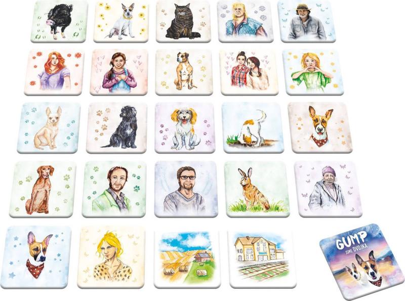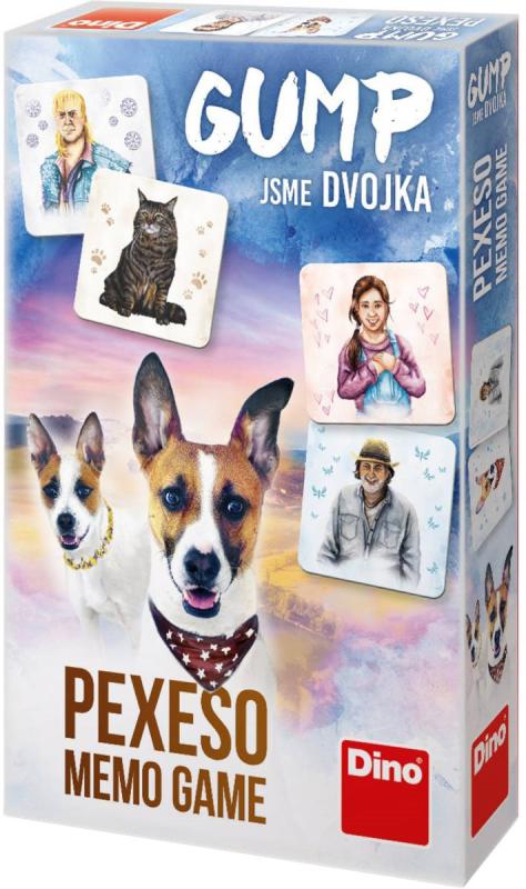 Společenská hra pexeso s motivem Gump: Jsme dvojka.Pro rozvíjení bystrosti není lepší společník než roztomilý Gump a jeho psí kamarádka Kytička! Pexeso s ilustrovanými obrázky psíka Gumpa, jeho páníčků a dalších čtyřnohých kamarádů je skvělý způsob, jak trénovat dětský postřeh. Hraní pexesa nejenže posiluje paměť, ale také učí děti trpělivosti. Užijte si zábavu a pozorujte, jak na začátku může být hra zdánlivě nekonečná, než se soupeř rozhodne otočit vybrané kartičky. Pexeso obsahuje 24 pevných kartonových kartiček a je vhodné pro děti od 4 let, ale i mladší šikulové se s ním mohou dobře bavit. Vše bylo vyrobeno a ilustrováno v ČR.