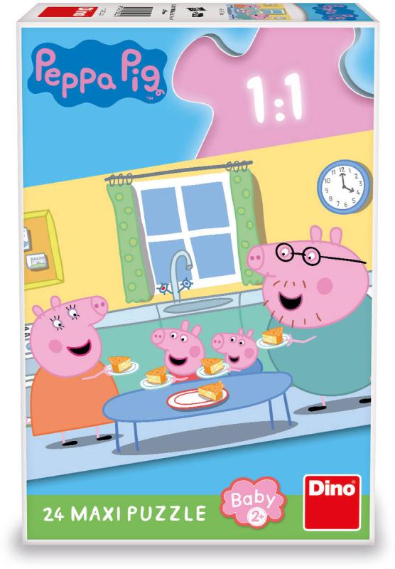 DINO Puzzle skládačka Peppa Pig (prasátko Peppina): Oběd, 24 dílků, velikost obrázku 47 x 66cm, velké maxi 12cm dílky, pro nejmenší děti.Prasečí slečna Peppa se svou rodinkou zrovna svačí dort. A jeden kousek ještě zbývá! Na ten třeba pozvou vašeho malého stavitele, až se mu podaří poskládat všech 24 dílků puzzle. Skládačka má extra velké dílky, které se dětem dobře obrací a ještě lépe hledají.