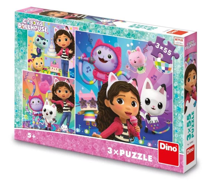 DINO Puzzle skládačka s motivy Gábi, 3x 55 dílků, velikost obrázku 18 x 18cm, 3 obrázky 3in1 (3v1).