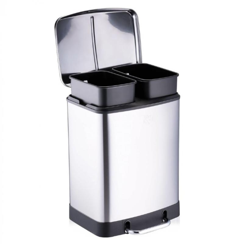 Nakládejte s odpadem ve vaší domácnosti vědomě díky tomuto odpadkovému koši Dirt Devil se 2 přihrádkami. Moderní šlapací odpadkový koš má 2 samostatné nádoby o objemu 12 litrů. Díky tomu je třídění odpadu mnohem jednodušší, protože do jednoho kontejneru můžete dát například plast a do druhého karton a papír. Díky nožnímu pedálu ve spodní části systému separace odpadu můžete otevřít víko bez použití rukou. Víko systému separace odpadu je vybaveno mechanismem soft-close. To znamená, že víko se zavírá tiše a tiše a zápach tak rychle neuniká. Pedálový odpadkový koš je vyroben z nerezové oceli stříbrné barvy. Tento materiál je známý tím, že je pevný a odolný, ale také se snadno udržuje v čistotě.