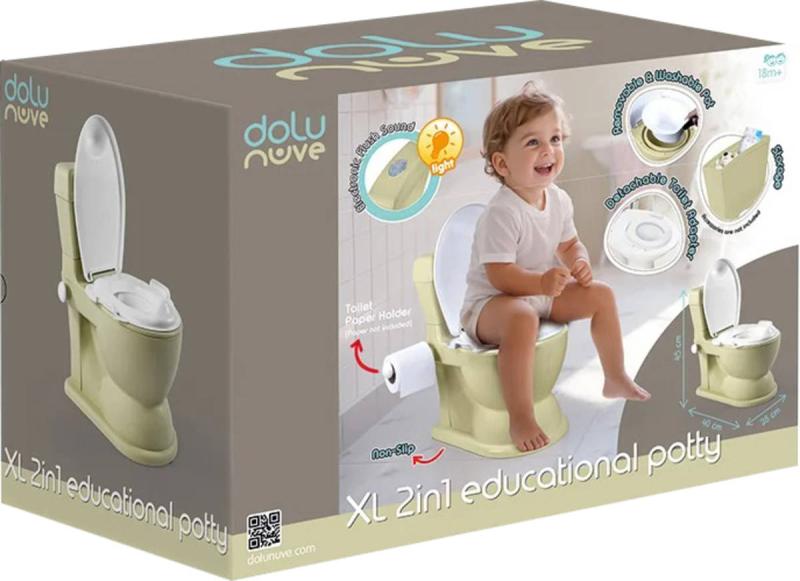 DOLU Dětská toaleta XL, baby WC záchod, světle zelená varianta, s držákem na toaletní papír, protiskluzová úprava, výrobek na baterie, se světlem a zvukem. Velikost 28 x 40 x 45cm.Začněte své děťátko učit na toaletu s realistickým nočníkem XL. Nočník vypadá jako skutečná toaleta. Je vybaven držákem na toaletní papír, tlačítkem se světelnými a zvukovými efekty a úložným prostorem. Po stisknutí tlačítka se ozve realistický zvuk spláchnutí. Protiskluzová základna pro lepší pro stabilitu a bezpečnost. Splachovací nádržka nočníku slouží jako úložný prostor, kde můžete uložit například vlhčené ubrousky. Vyjímatelná vnitřní komora pro snadné vyprazdňování a čištění zajišťuje dokonalou hygienu. Další výhodou je odnímatelné WC sedátko, které lze použít jako redukce WC prkénka na klasické toaletě.