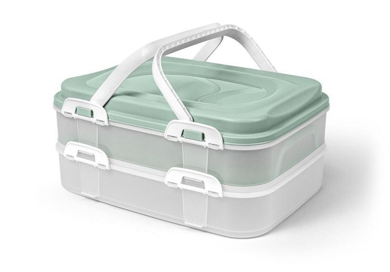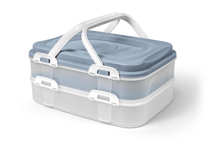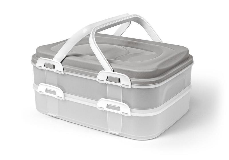 Plastová dóza PIKNIK s praktickými uchy, má 2 patra, vhodná pro skladování různých druhů potravin."