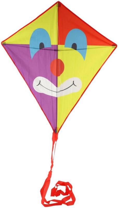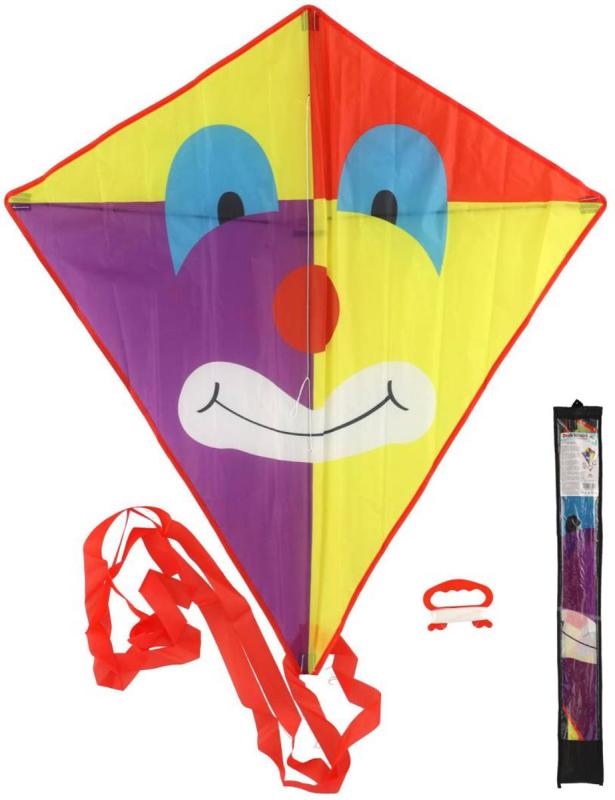 Veselý létající nylonový drak barevný Klaun, klasický tvar o velikosti 78 x 86cm.Pouštění draka je skvělou zábavou na podzimní větrné dny. Barevný drak je ve vzduchu krásně viditelný. Je velmi obratný a má jednoduchou konstrukci. Děti si pouštění draků zamilují, při pohledu na svobodně létajícího draka na obloze se nenásilnou formou i něco zajímavého dozví o větru i počasí.