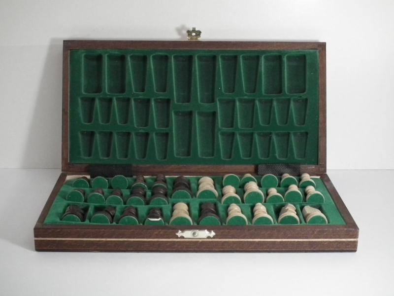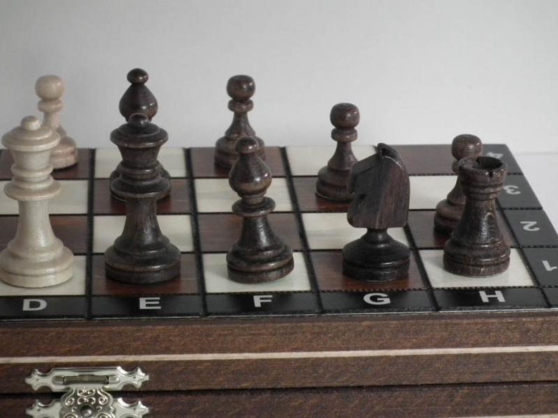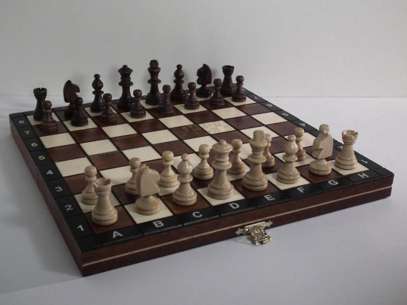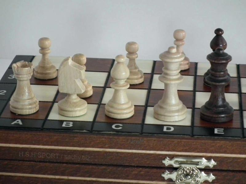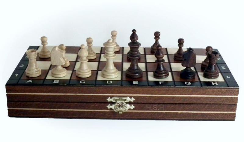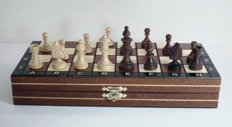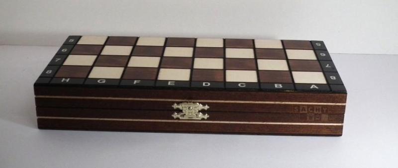 Klasické magnetické šachy s dřevěnými figurkami a dřevěnou šachovnicí vhodné jako cestovní šachy s popisem na šachovnici. Šachovnice (29 cm) má pole oddělená gravírovanou ozdobnou linkou a černý rám zajímavě uzavírající světlejší hnědou a bílou. Díky tomu má i přes nízkou cenu atraktivní vzhled. Vhodné pro rekreační i soutěžní hráče, protože vzhled figur vychází z turnajového standardu "Staunton".Váha(kg): 0,58
