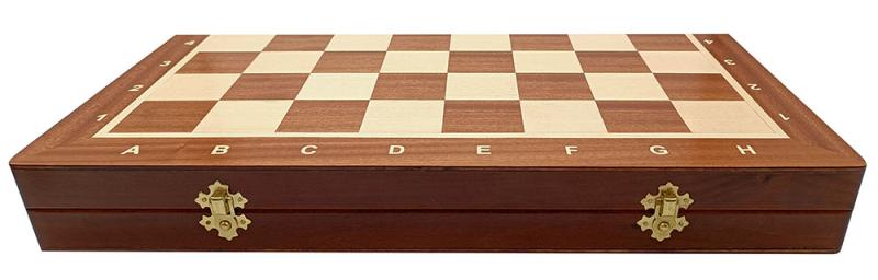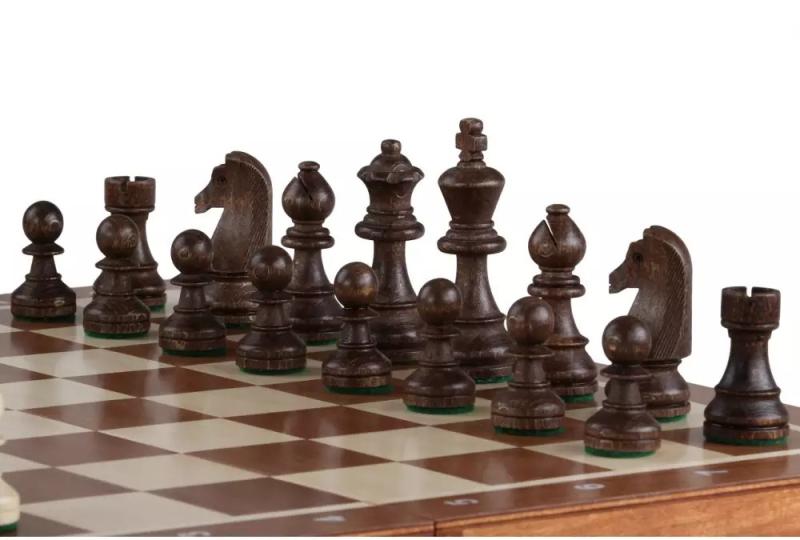 Turnajové šachy ve středně velkém provedení - figurky typu Staunton o velikosti č. 5, velikosti políčka 5x5 cm. Vhodný kompromis pro menší turnaje a pro domácí použití. Šachovnice je v pěkném intarzovaném provedení, figurky jsou matně mořené, mají alespoň základní závaží pro zlepšení stability. Tato sada obsahuje i dvě extra dámy, které se dají uložit s ostatními figurami.Poznámka: s uložením figurek