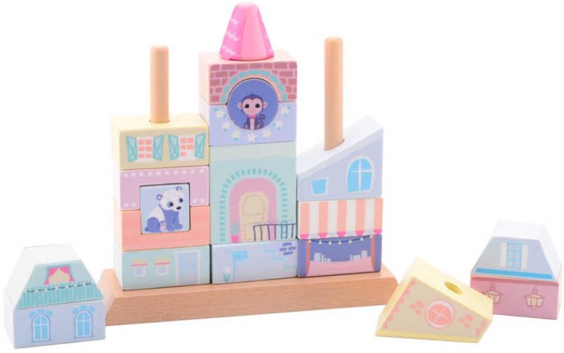 Jouéco The Wildies Family dřevěný stohovací domeček. Navlékačka s pomalovanými kostkami v jemných, pastelových barvách, pro nejmenší děti.Sada obsahuje kostky na stavbu domečku s dveřmi, okénky atd., které se navlékají na základnu se třemi tyčkami. Vyrobeno z kvalitního bukového dřeva, barveno nezávadnými barvami, testováno