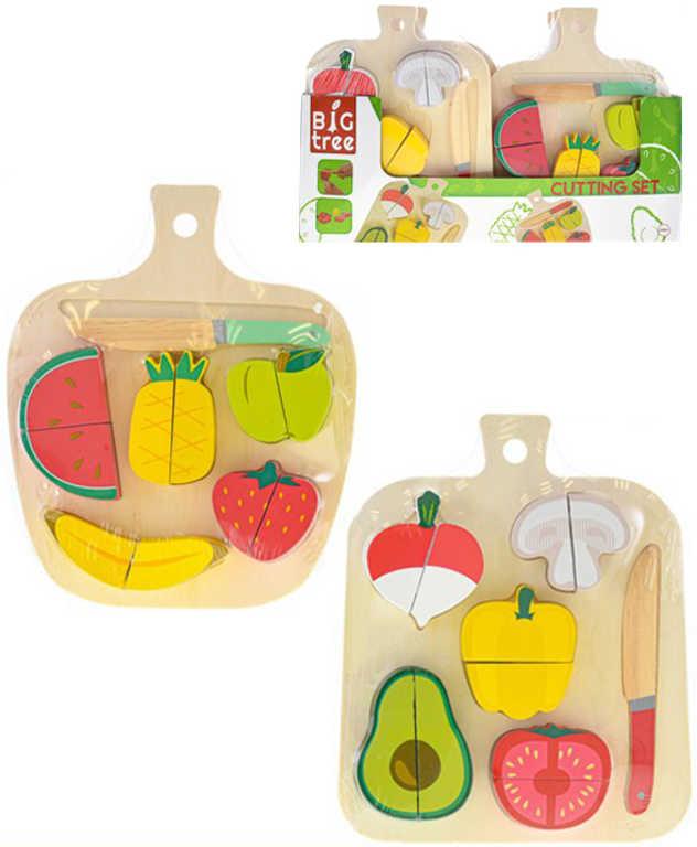 Sada dřevěného krájecího ovoce a zeleniny, pro všechny holčičky, které si rády hrají na kuchařky nebo na prodavačky. Součástí balení je i nožík a prkýnko na krájení. Hračka ve dvou variantách provedení.Dřevěné napodobeniny potravin na suchý zip z plastu. Sada obsahuje různé druhy potravin, prkénko a nožík, kterým můžete potraviny krájet. Dětské makety krájecího ovoce a zeleniny na suchý zip s