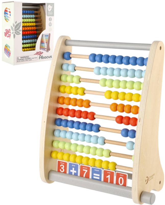 Klasické stolní dřevěné počítadlo, přírodní natur provedení, barevné kuličky 10x10. Součástí kartičky s číslicemi 0-9 a matematickými znaménky, v angličtině AJ.Barevné dřevěné počítadlo s 10 řadami korálků představujících čísla je klasickou hračkou, kterou ocení každý učitel matematiky. Podporuje logické myšlení a pomáhá při prvních početních úkolech. Hračka pomáhá vykonávat různé činnosti a zároveň rozvíjí motoriku při pohybu pohyblivých prvků. Počítadlo je vhodné pro individuální učení, ale najde uplatnění i v mateřských a základních školách.