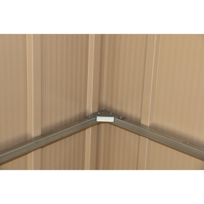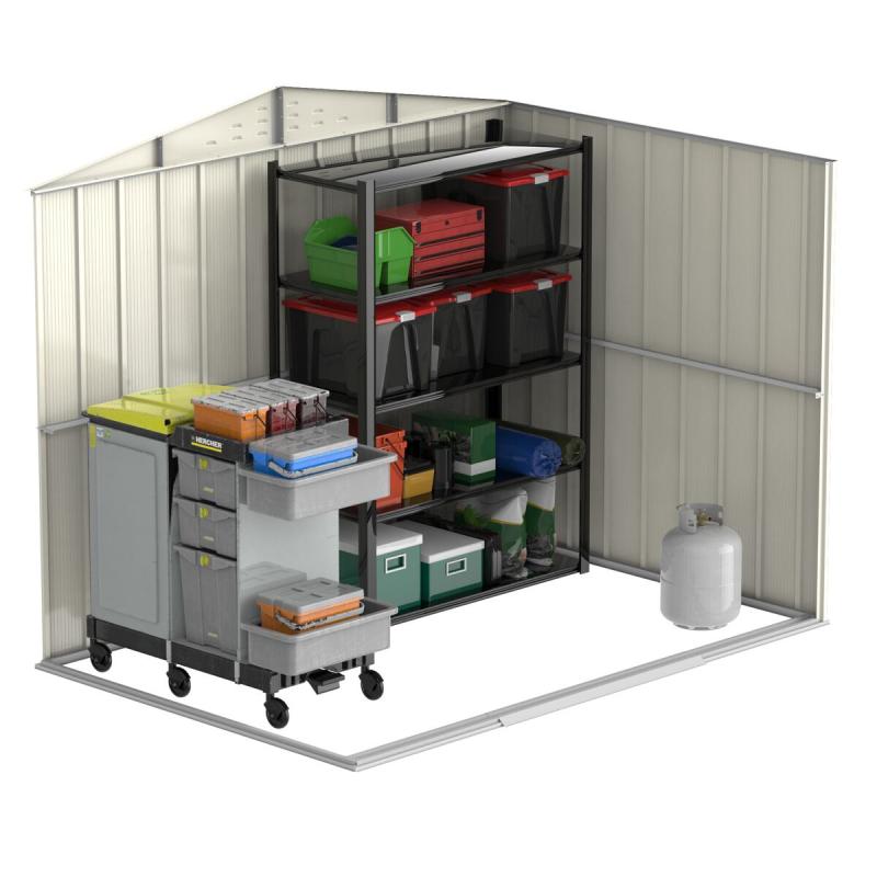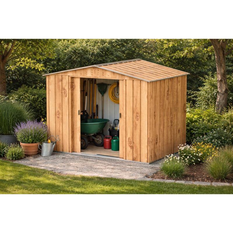 Domek je vyroben z ocelového, žárově pozinkovaného plechu s práškovým nástřikem, což zajišťuje odolnost a nevyžaduje žádnou údržbu. Praktické dvoje velké posuvné dveře s úchyty, které lze zabezpečit visacím zámkem, a vysoký dveřní otvor usnadňují přístup a manipulaci s uloženými předměty. Díky tomu je domek vhodný k uskladnění zahradního nářadí, nábytku, sekaček, křovinořezů, sportovních potřeb a dalších věcí.