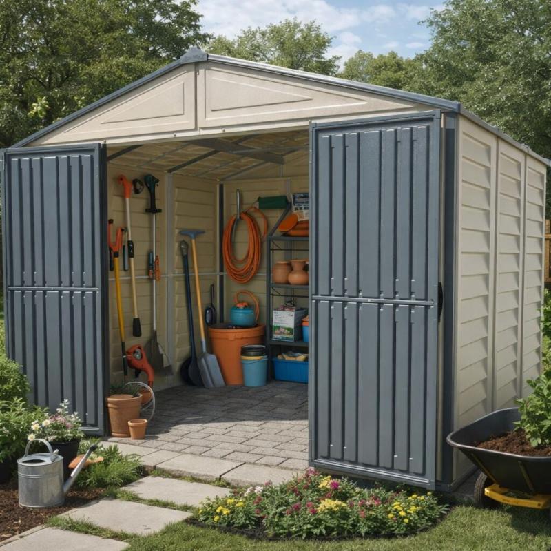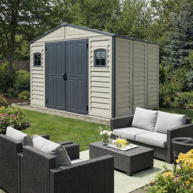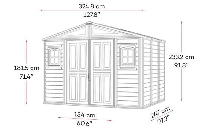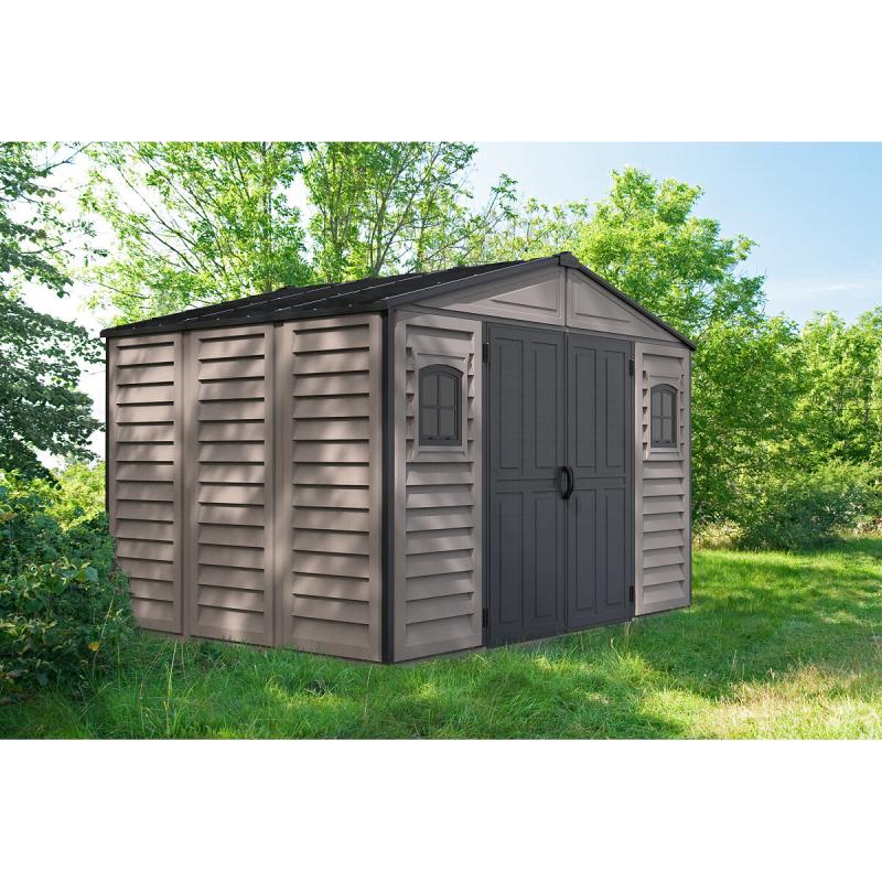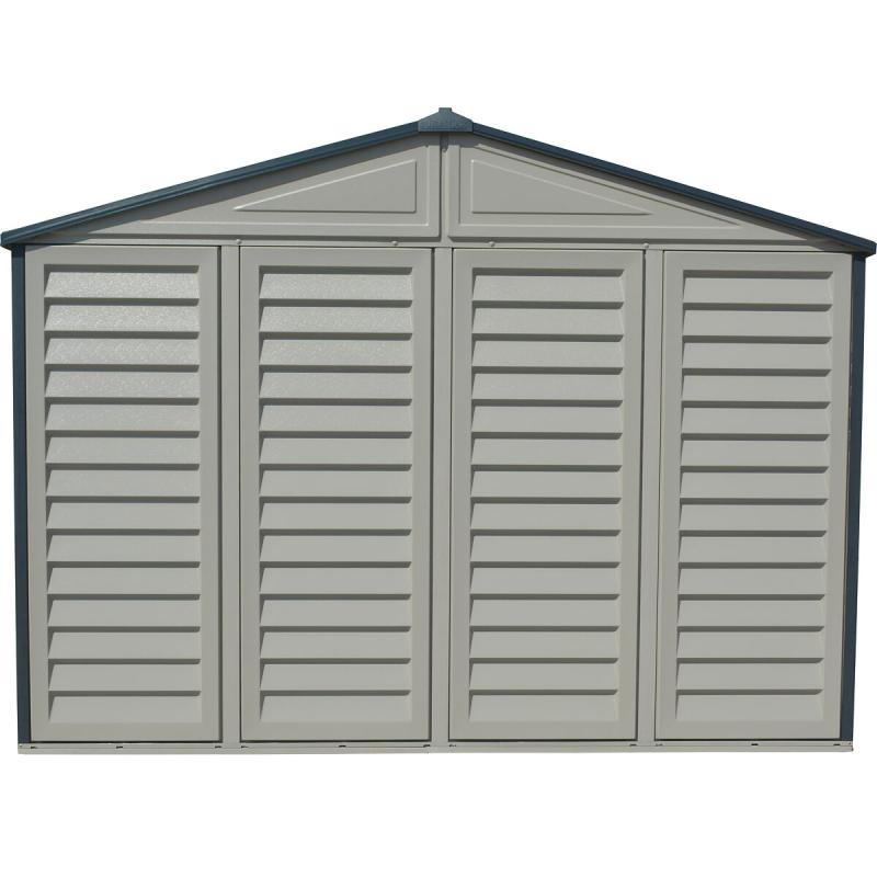 Plastový zahradní domek Duramax WOODBRIDGE Plus II antracit 10x8 je díky svým velkým rozměrům skvělým řešením k ukládání Vašeho zahradního náčiní a nářadí. Tento zahradní domek je jedním z největších plastových zahradních domků na trhu. Je osazen dvojitými dveřmi, které značně ulehčují přístup k uloženým předmětům. Lze v něm uskladnit všechno potřebné nářadí a náčiní na zahradu, například sekačky, křovinořezy, žebříky, lopaty, hrábě, ale také velmi rozměrné předměty, jako zahradní nábytek, čtyřkolky, traktůrky, atd. Vnitří objem je vzhledem k rozměrům opravdu velký a hlavně skvěle využitelný.