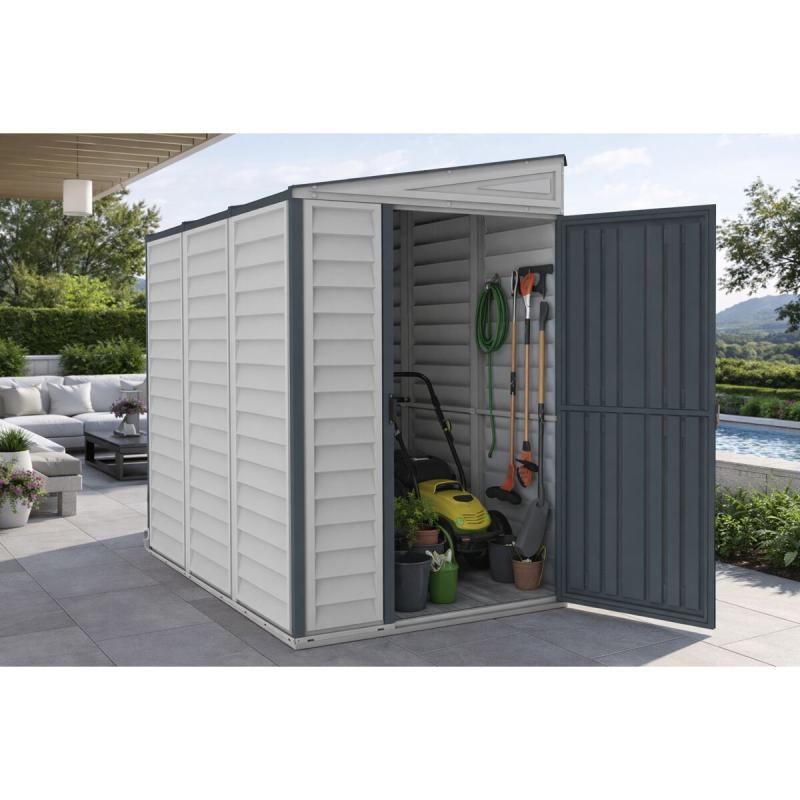 Kompaktní zahradní domek z vinylu odolný proti povětrnostním vlivům s prostorným úložným prostorem a praktickými oboustrannými dveřmi pro snadný přístup. zobrazit celý popis
