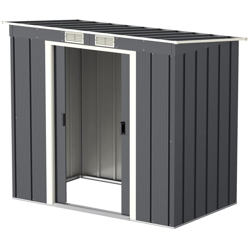 Kovový zahradní domek o ploše 2,5 m² s pultovou střechou, odolný vůči počasí, s podlahovou konstrukcí pro snadnou instalaci na různé povrchy.