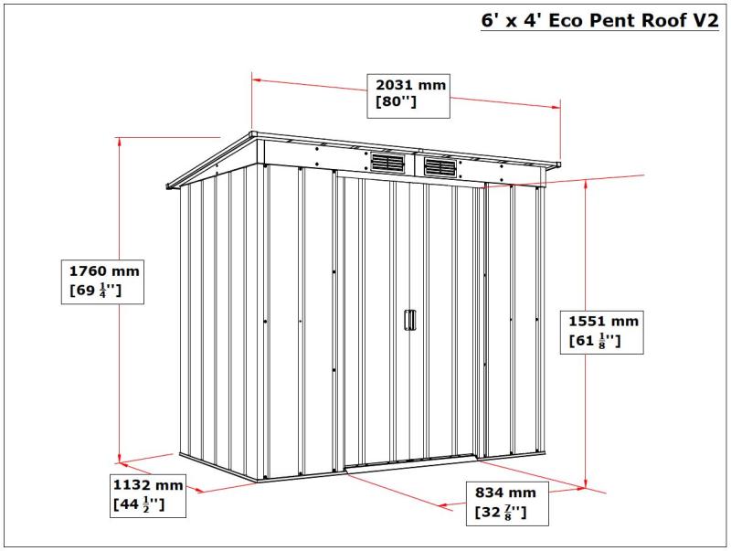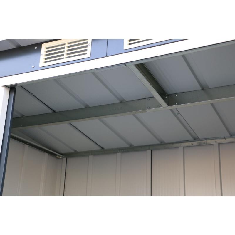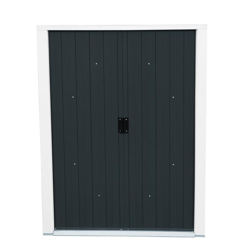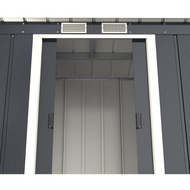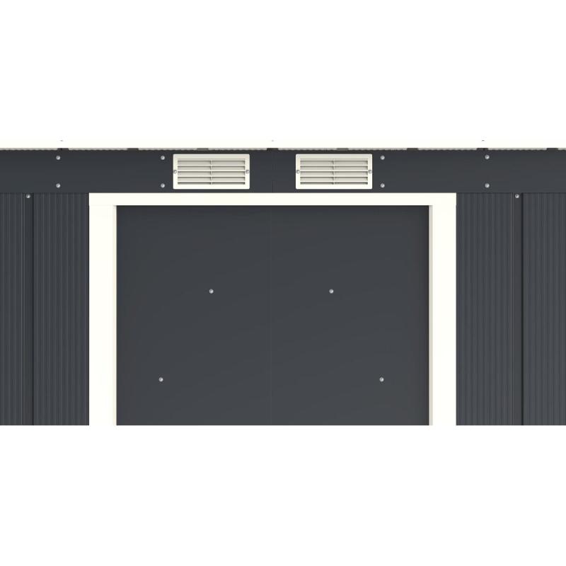 Pultová střecha přináší moderní vzhled a zároveň efektivní odvod vody. Domek zvládne bezpečně unést sněhovou zátěž až do 80 kg/m², což je důležité pro zajištění stability v zimních měsících. Vstup usnadňují dvoje velké posuvné dveře s vysokým dveřním otvorem, který umožňuje pohodlný přístup i s objemnějšími předměty.