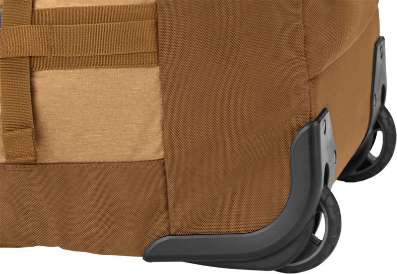 Odolné dno je polstrované pěnou, která chrání uložené věci před nárazy, a boční zpevněné úchyty umožňují upevnění tašky ke střešnímu nosiči. Dvě odolná kolečka s ochranným krytem zajišťují hladký pojezd, což usnadňuje manipulaci i při větším zatížení.