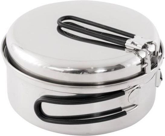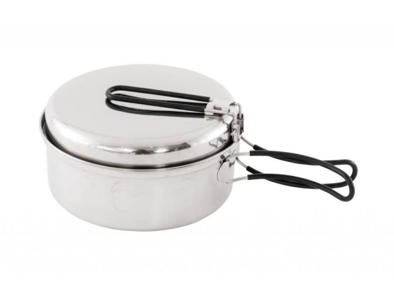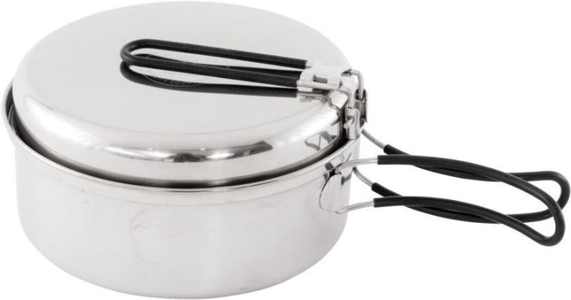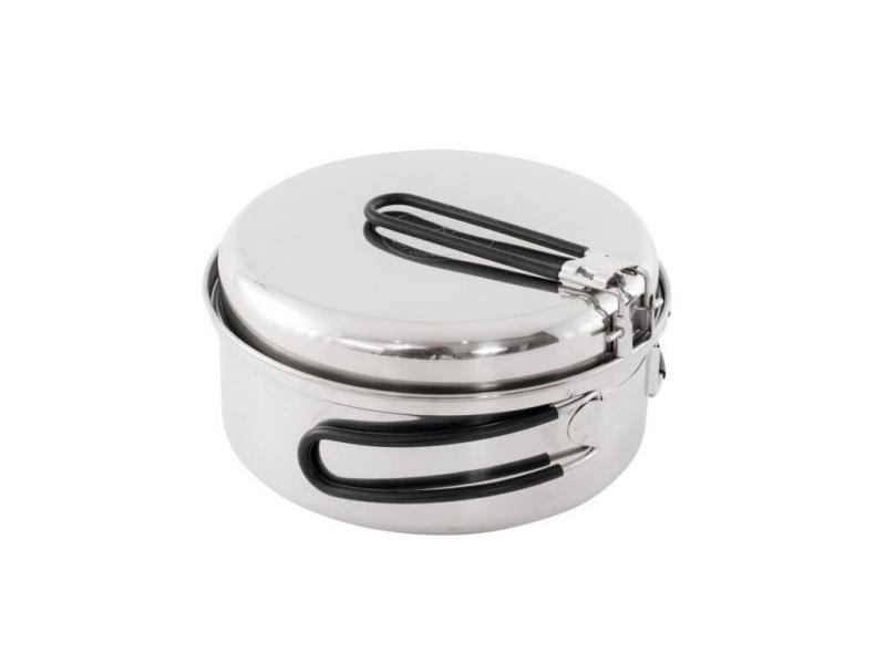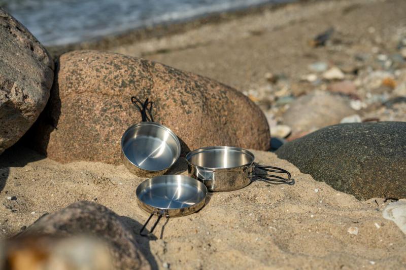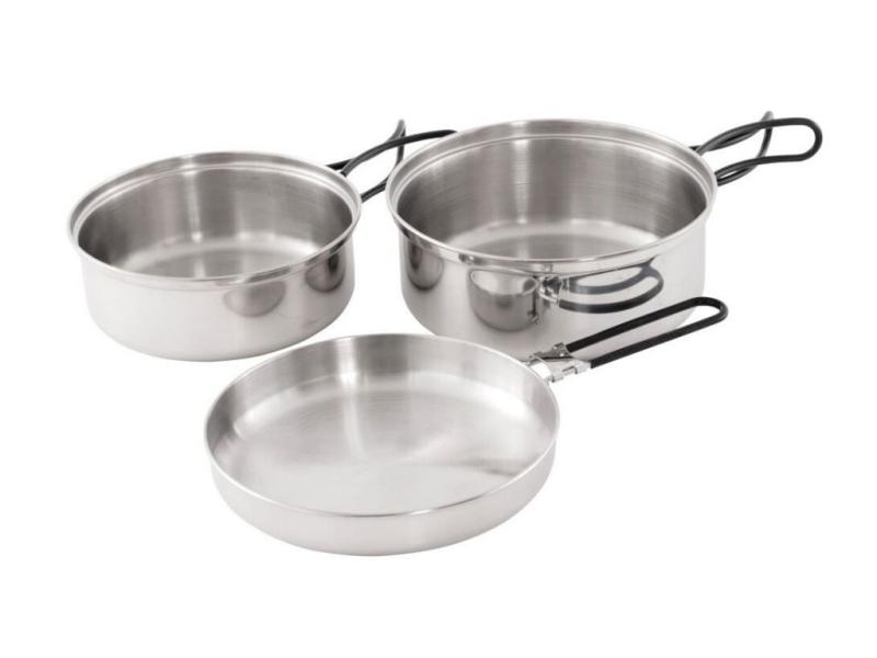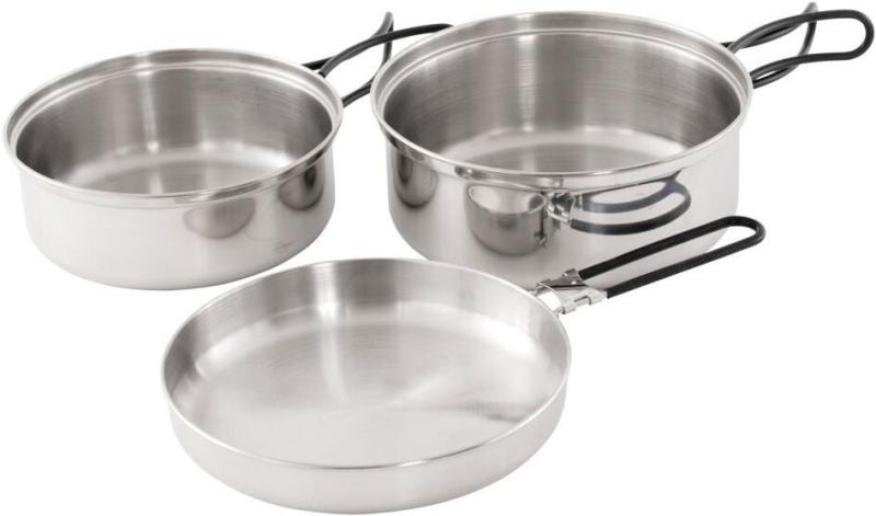 -sada nádobí z nerezové oceli vhodná pro použití na vařičích i otevřeném ohni-sada obsahuje dva hrnce různých velikostí a pánev, kterou lze použít jako poklici