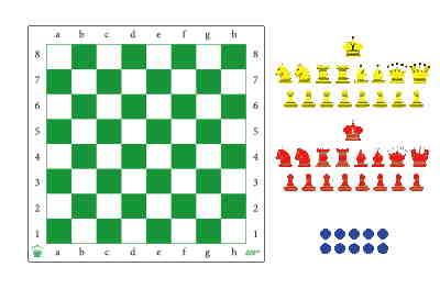 Šachovnica je dodávaná s kompletnou sadou figúrok + dve kráľovné navyše od každej farby a didaktickými bodkami – pre kompletné šachové vyučovanie.