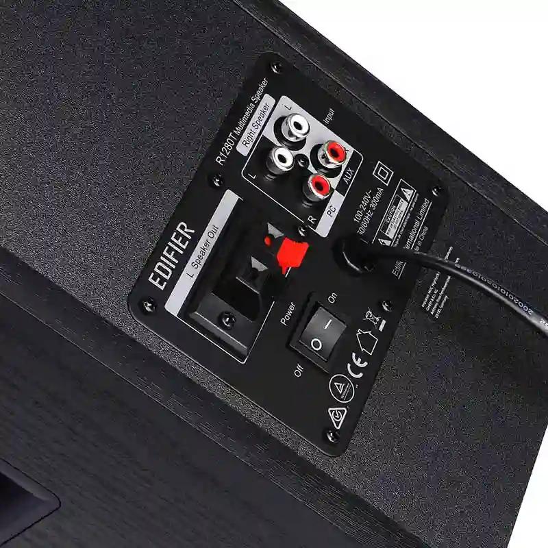 Reproduktor R1280T lze připojit k různým zvukovým zařízením prostřednictvím dvou vstupů RCA. Při pohledu na zadní panel snadno poznáte, který z nich je pasivní a druhý aktivní reproduktor. Aktivní reproduktor má dva vstupy umístěné na zadním panelu. Tyto vstupy jsou ideální pro připojení RCA na RCA nebo RCA na AUX. Připojte je k počítači, notebooku, tabletu, telefonu nebo přehrávači. Reproduktory se k sobě připojují pomocí běžného reproduktorového kabelu.